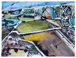 Und noch die „Verwandlungen“ I-XXII (alle 2018), die neueste, in hochkomplexen künstlerischen Verfahren entstandene Bilderfolge, ist ohne die Farbe Blau nicht zu denken. „Ohne Blau geht gar nichts“, sagt Astrid Albers selber. Die „Verwandlungen“ sind als Acryldrucke auf Bütten gefertigt, wobei die Künstlerin in einem weiteren Arbeitsschritt mit Ölkreide in den Druck hineinmalt. Formalere Arbeiten sind dadurch entstanden. Weiße Spuren – ein Stück bewußt unbedrucktes Papier – und schwarze Linien teilen streng abgegrenzte Farbflächen voneinander ab, und trotz aller Binnenstrukturierung dieser Flächen trennt unser Auge einzelne Farbfelder. Gerade Linien unterteilen das Bild, ich denke an Äcker und Wiesen. Hier läuft nichts ineinander oder umschlingt sich in quirligem Tanz. Eisblau ist das Blau, und kühle Pastelltöne beherrschen die Bildflächen: Fliederfarben und Veroneser Grün, Weißgrau und Hellgelb, hier und da ein bißchen Altrosa. In langen Strähnen stürzt ein Wasserfall zu Tal (XXII). Wenn es Küsten sind, die man sehen kann, dann sind es diesmal wirklich ganz nördliche. Hat so die Zukunft begonnen?